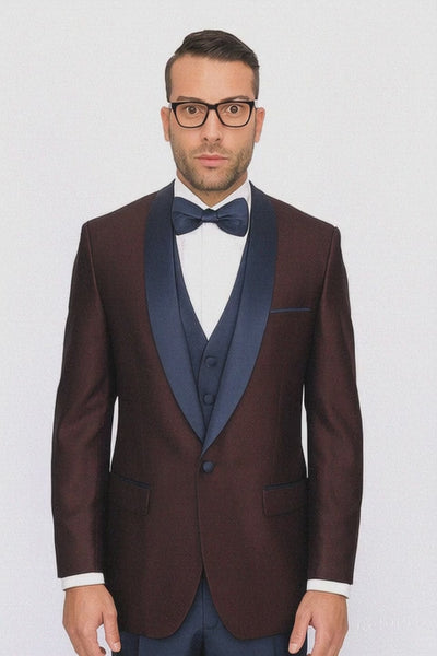 This suit is a premium wedding, prom, and party tuxedo, designed to make a bold yet elegant statement. With a rich burgundy/plum base accented by a contrasting dark navy shawl lapel, it balances luxury with modern sophistication. The 3-piece design includes a single-breasted blazer, matching waistcoat (vest), and tailored trousers, making it versatile for both formal and semi-formal occasions.