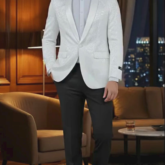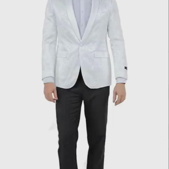 Make an unforgettable impression with this silver paisley tuxedo jacket, designed to combine style, confidence, and sophistication for every formal event.