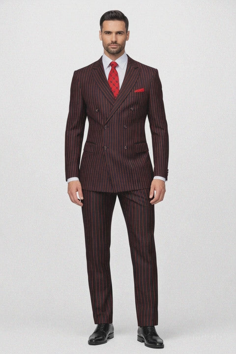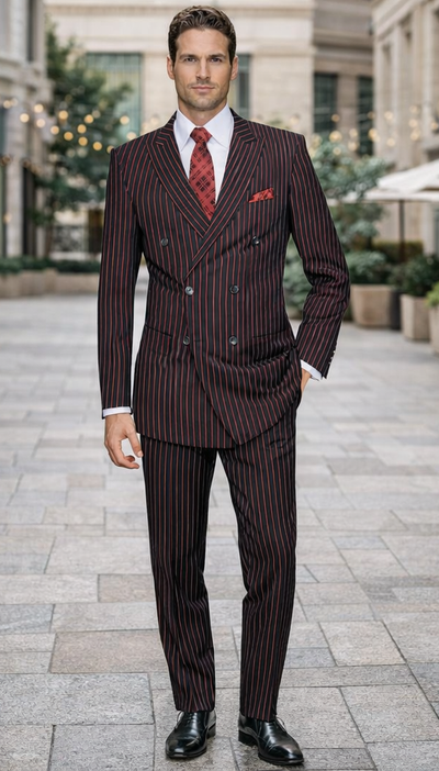 Black and Red Pinstripe Double breasted Suit - 100% Wool Modern Fit Side Vents by Statement brand