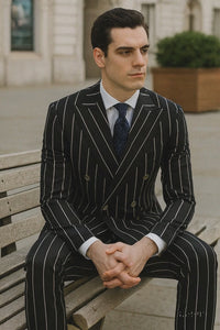 Step back into the roaring 1920s with this classic black pinstripe double-breasted suit, a timeless piece that channels the bold confidence of the gangster era. Featuring sharp chalk pinstripes, broad peak lapels, and a structured double-breasted closure, this suit embodies old-school charm with a touch of power dressing.