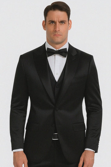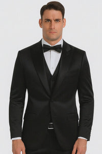 Black Satin Double Breasted Peak Lapel 3 Piece Skinny Fit Tazzio Men's Suit with Matching Bowtie