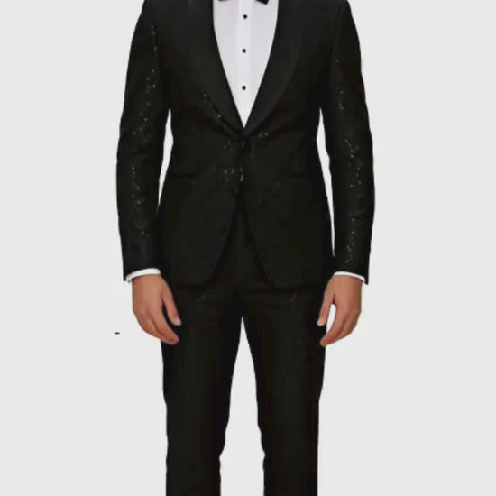 Black Sequin Tuxedo Suit with Satin Shawl Lapel – Mens Slim Fit Formal Prom and Wedding Attire