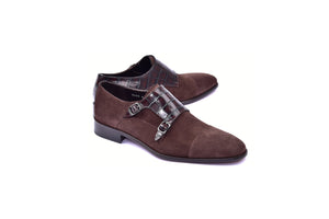Introducing the 6433 Cap Toe Monk strap in Brown Suede. This stylish shoe features a combination of suede leather and crocco print vamp, providing a unique and sophisticated look. Perfect for any formal occasion, this shoe offers both style and comfort.