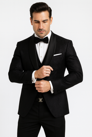 Classic Black Floral Lace Tuxedo with Vest – Modern Men’s Wedding Suit