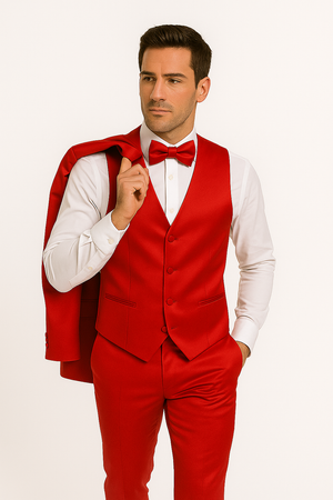 Step into the spotlight with the Red Satin Tuxedo Four-Piece Set, designed for the man who dares to be different.This luxurious ensemble includes a glossy red tuxedo jacket, matching vest, fitted trousers, and a satin bow tie all in perfectly coordinated deep red tones.