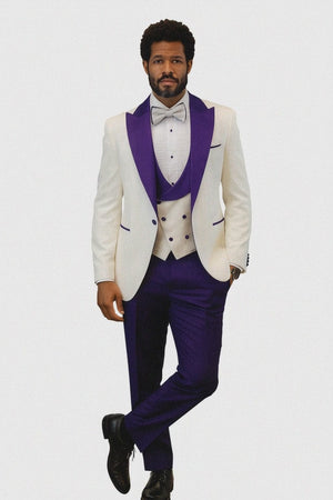 Hilton White and Purple Paisley Peak Lapel Tuxedo Jacket with Matching Shawl Vest and Wool Pants – Includes Bow Tie