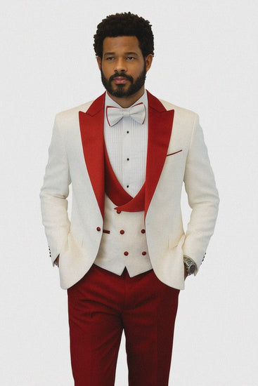 Make a striking entrance with the Hilton White & Red Paisley 3-Piece Formal Ensemble, a bold and stylish tuxedo set crafted for men who want to stand out with confidence. This combination of crisp white paisley fabric and rich red satin detailing makes it an unforgettable choice for weddings, galas, proms, or stage events.