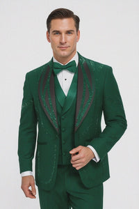 Stand out on your big day with this hunter green Italian wool tuxedo, designed for grooms who want something bold yet elegant. The modern fit cut ensures a sleek profile, while the matching vest and flat-front trousers complete the polished 3-piece look. Ideal for weddings, receptions, and engagement celebrations, this tuxedo delivers sophistication with a touch of individuality.