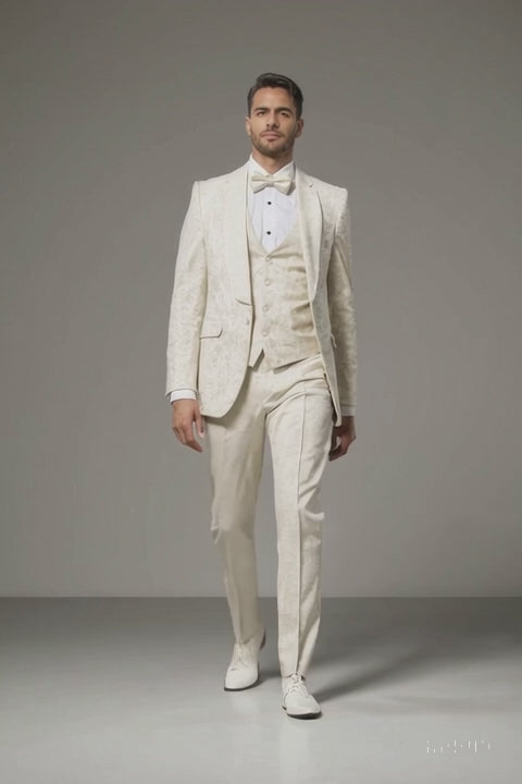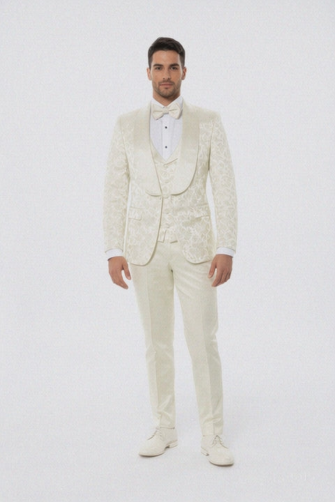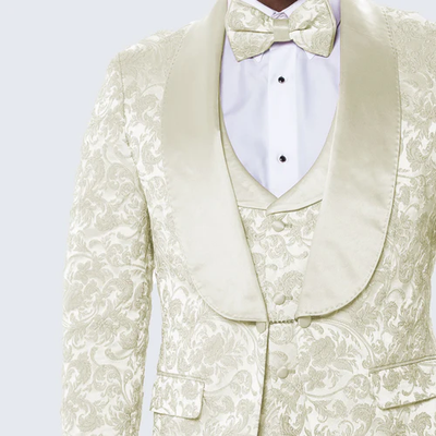 Ivory Floral Tuxedo Suit – Wide Shawl Lapel for Weddings