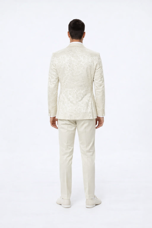 Constructed from premium floral jacquard fabric, the tuxedo features a delicately textured surface that subtly reflects light, giving it a luxurious sheen. The ivory color embodies purity, grace, and confidence — a perfect choice for grooms, best men, or special guests seeking a sophisticated statement piece. The floral pattern adds depth and visual richness, merging traditional charm with modern flair.