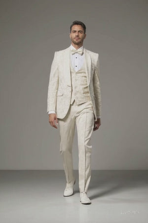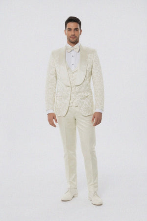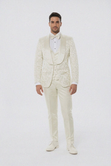 Step into the spotlight with the Ivory Floral Wide Shawl Lapel Tuxedo Suit, where classic tailoring meets contemporary design. Whether you’re the groom or a distinguished guest, this ensemble guarantees one thing — an unforgettable impression of refined luxury.