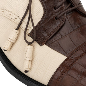 Two-Tone Design: A striking contrast of ivory lizard leather and brown crocodile cap toe highlights the shoe’s refined character.