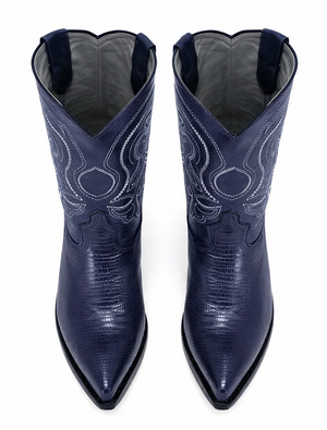 Crafted from 100% genuine Teju lizard leather, these boots stand out for their unique natural scale pattern and luxurious texture. Teju lizard skin is highly prized for its durability, flexibility, and exotic appearance, ensuring that each pair of boots is truly one of a kind. The rich navy blue color adds a refined, contemporary edge while remaining versatile enough to complement a wide range of outfits.
