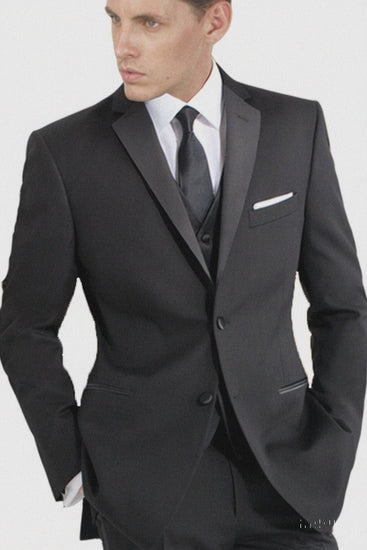 This tuxedo is an incredible value! Crafted from pure worsted wool, it features a 2-button coat with a satin notch lapel, satin-trimmed flap pockets, side vents, and flat front satin-trimmed pants.
