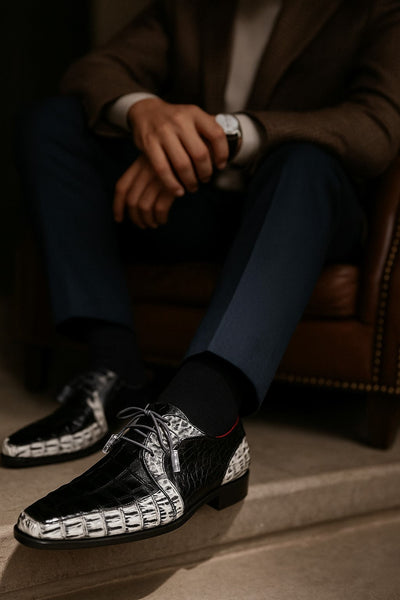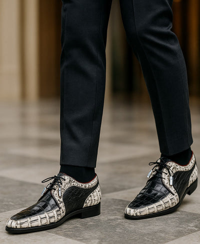 Unleash expressive style and unparalleled craftsmanship with the Marco Di Milano Caribe Newspaper-Black Caiman Crocodile Derby—a daring fusion of luxury fashion and artisanal storytelling. This one-of-a-kind exotic shoe is a modern masterpiece that redefines elegance with a striking "newspaper-print" artistic finish layered over genuine caiman crocodile leather. Designed for gentlemen who make bold choices, the Caribe Derby is where heritage meets high fashion.