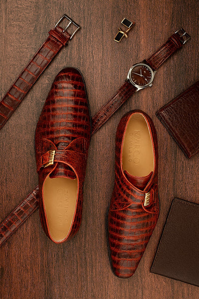 Handmade by master artisans, these monk-strap loafers are constructed using the finest crocodile skin, celebrated for its unique scale pattern and natural sheen. The cognac color finish delivers a rich, warm tone that enhances the organic texture of the hide—offering both visual depth and timeless sophistication.