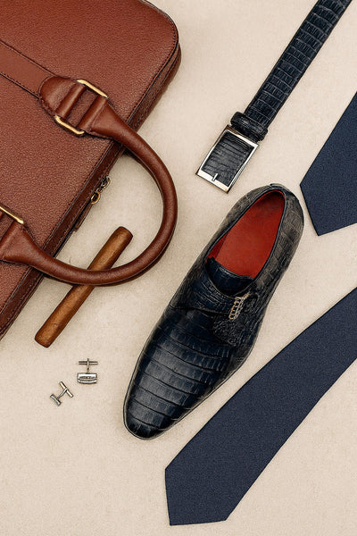 Perfect for business meetings, weddings, or upscale social events, these shoes blend classic Italian shoemaking techniques with modern luxury aesthetics. The navy crocodile leather adds rich texture and bold personality, while the single monk strap provides a minimalist yet distinctive profile.