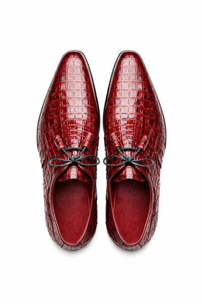 Exceptional pair of shoes! The caiman leather is rich, textured, and elegant — truly eye-catching. The wine and burgundy hues blend seamlessly, giving a sophisticated look that elevates any outfit. The derby lace-up style feels classic yet refined. I wore these to a wedding and felt incredibly sharp. – Ricardo T.