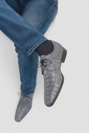 - These Grey crocodile oxford shoes are completely made in the Italian method of shoe making with complete leather linings that coddle your feet.