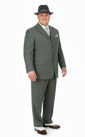 This three-piece zoot suit features a long-line jacket with wide notch lapels, a matching vest, and pleated trousers designed for a comfortable, tailored fit. The sleek gray tone exudes refinement, while the extended jacket design adds an authentic 1920s flair. Paired with a fedora hat and wingtip shoes, this suit makes a commanding statement — ideal for weddings, themed parties, performances, or formal occasions.