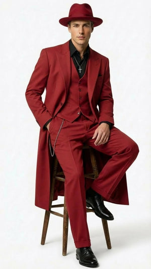 Bring back the bold style of the Prohibition era with this Men’s 1920s Red Zoot Suit, designed with a classic long-line overcoat and wide-leg trousers that capture the signature look of vintage gangster and mafia fashion. Tailored in a striking deep red tone, this three-piece suit includes a long coat, matching vest, and pants for a complete period-accurate ensemble.