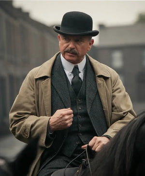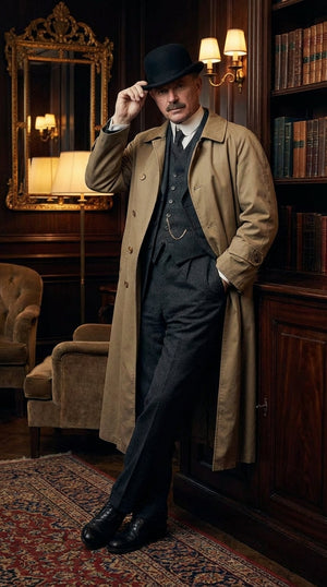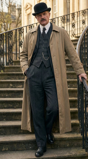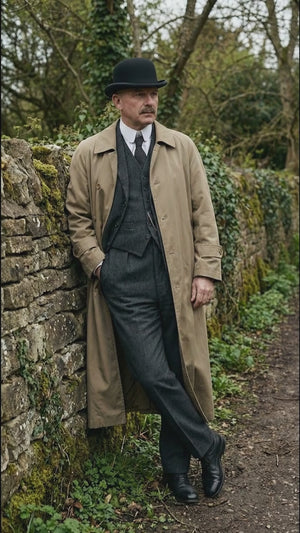 Men’s Beige Cotton Trench Coat Suit Package – Classic Long Overcoat for Formal + Suit + Hat