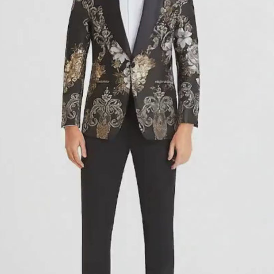 Men’s Black and Gold and Silver Floral Jacquard Blazer with Satin Shawl Lapel Tuxedo Suit With Black Pants with Bowtie