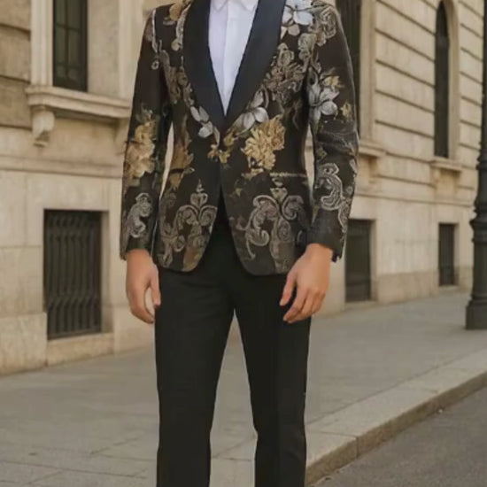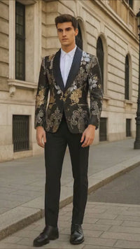 Make a bold style statement with this men’s black floral jacquard blazer, designed for weddings, parties, and upscale events. Crafted from luxurious jacquard fabric, this blazer features an intricate floral and baroque-inspired pattern in gold, silver, and white accents. The satin shawl lapel adds a refined touch, elevating the jacket’s modern elegance. Tailored for a slim fit, it offers both comfort and sophistication, making it perfect to pair with dress trousers or formal slacks. Ideal for grooms, groomsmen, prom, or anyone looking to stand out at a special occasion, this blazer delivers a perfect blend of classic charm and contemporary fashion.
