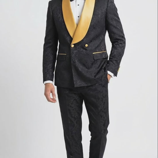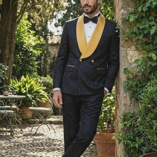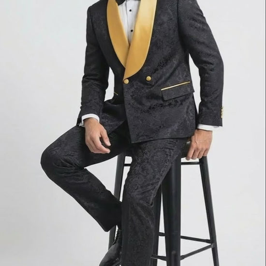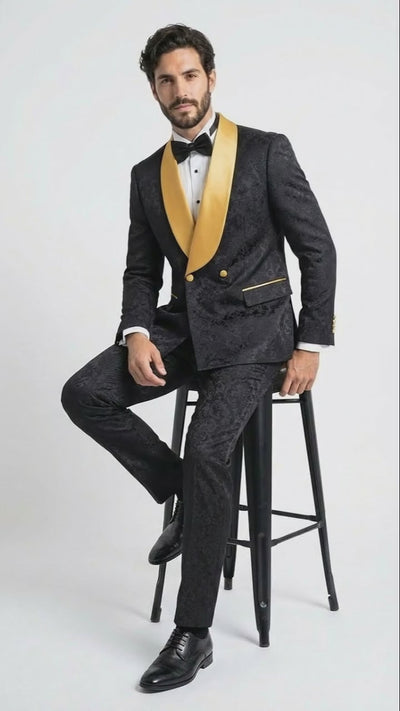 Men’s Black and Gold Jacquard Tuxedo Suit – Luxury Slim Fit Formal Wedding, Prom, and Gala Outfit