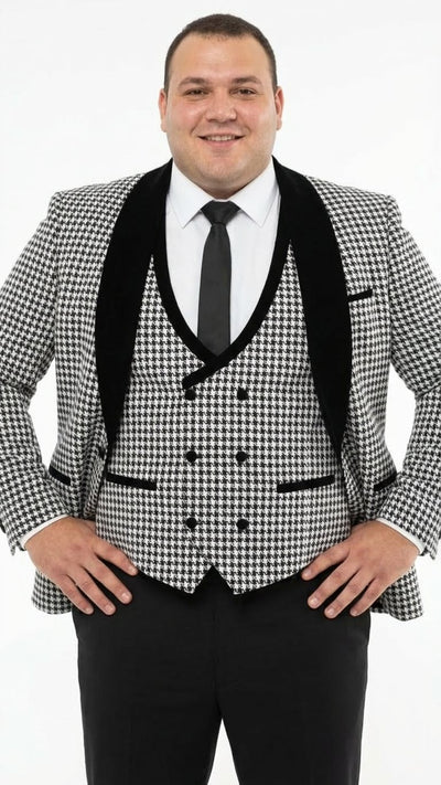 The jacket features a black velvet shawl lapel that adds depth, luxury, and contrast to the sharp houndstooth pattern. The double-breasted vest enhances the silhouette and provides a polished, distinguished appearance perfect for weddings, proms, galas, red-carpet events, and upscale parties.