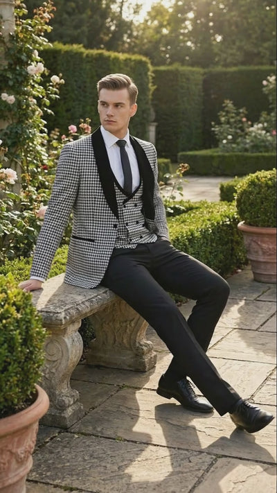 Men’s Black and White Houndstooth Tuxedo Set with Velvet Shawl Lapel | 3-Piece Formal Suit with Double-Breasted Vest