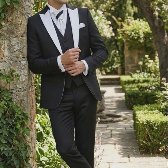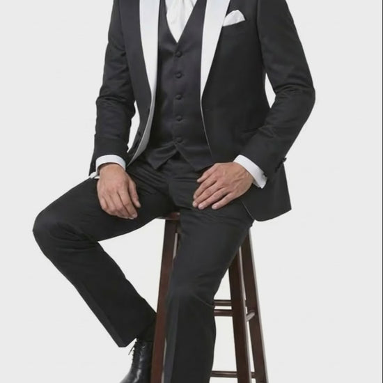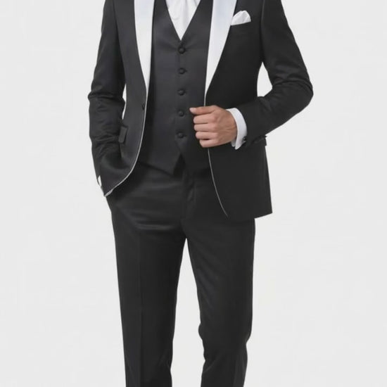 Men’s Black and White Lapel Prom Tuxedo Suit + Black Vest + Black Pants Peak Lapel