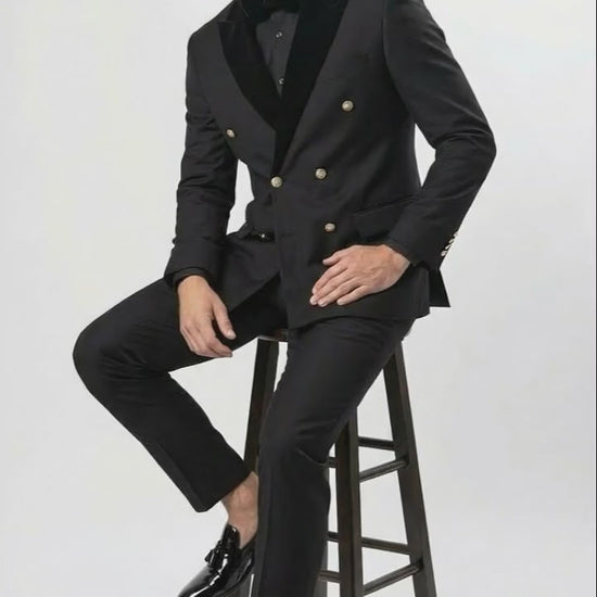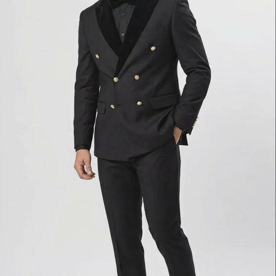 Men’s Black Double Breasted Tuxedo Suit – Luxury Formal Dinner Jacket Gold Buttons Velvet Lapel