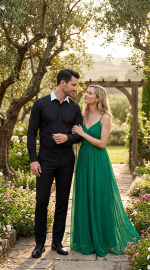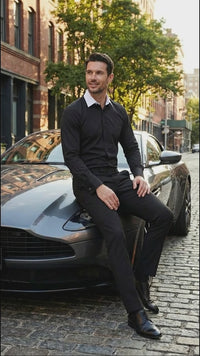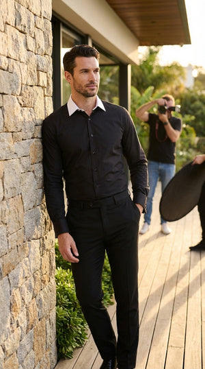 Make a sharp statement with this men’s black dress shirt featuring a crisp white contrast collar for a clean, modern formal look. Designed in smooth cotton poplin, this black and white button-up shirt delivers a polished finish that works perfectly for business wear, weddings, formal events, and evening occasions.