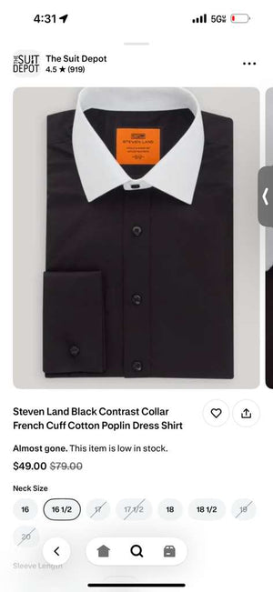 The elegant French cuff sleeves are made for cufflinks, giving this shirt a premium, dressy appearance that pairs easily with suits, tuxedos, blazers, and dress pants. The classic black body color combined with the bright white collar creates a standout style that is ideal for black tie outfits, special occasions, and professional settings.