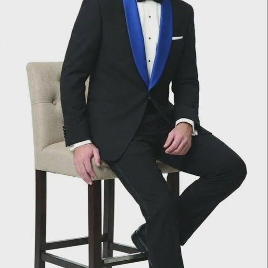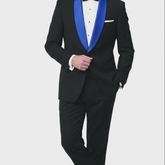 - Classic black tuxedo with a modern royal blue shawl lapel