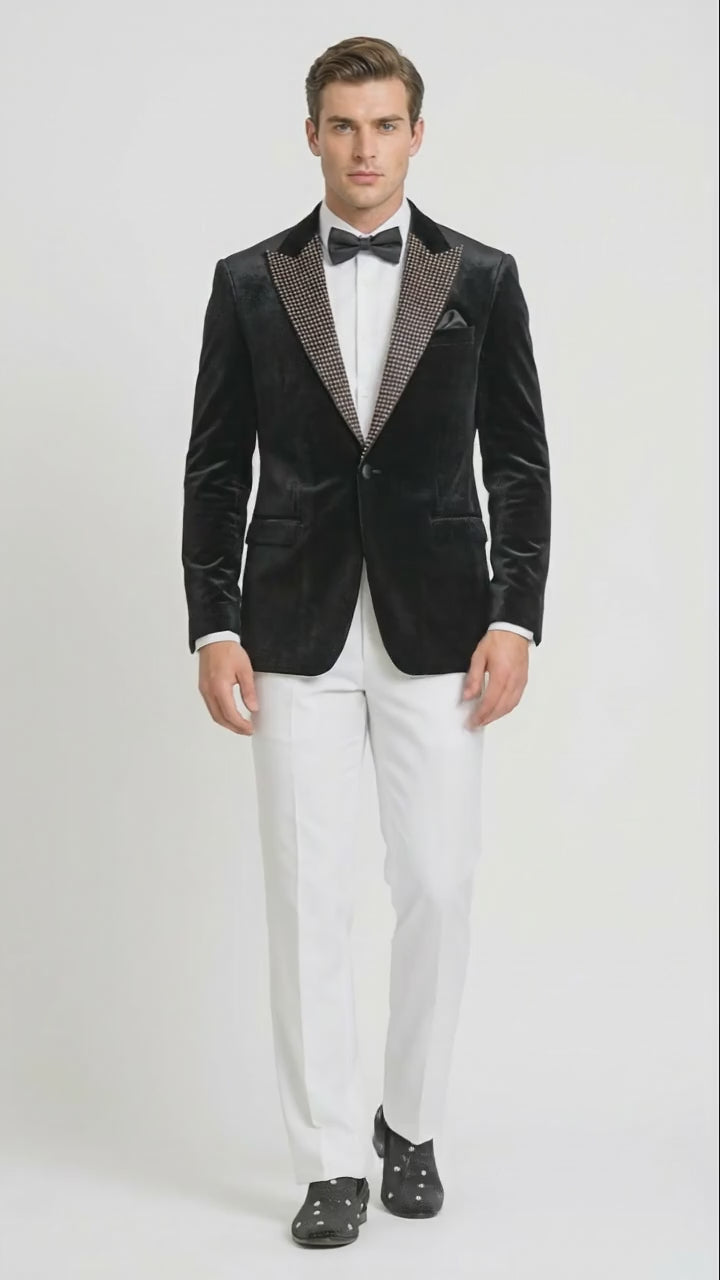 Men’s Black Velvet Tuxedo Blazer with Studded Lapel – Formal Evening Jacket