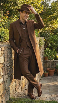 Bring back the bold elegance of the 1920s with this Men’s Brown Long Zoot Suit, designed in the iconic gangster and mafia style of the Prohibition era. This premium three-piece ensemble features a dramatic long overcoat, matching vest, and wide-leg trousers, creating the classic silhouette that defined vintage zoot fashion.