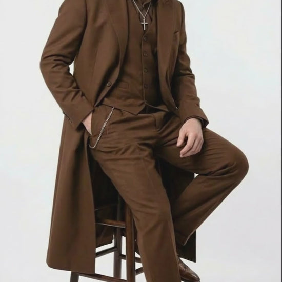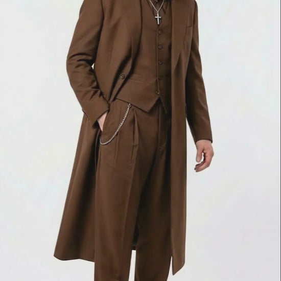Crafted with durable, comfortable fabric, this suit offers a rich brown tone that enhances its timeless appeal. The extended coat design adds a commanding presence, while the tailored vest and relaxed trousers complete an authentic retro look. Perfect for themed parties, stage performances, cosplay, photo shoots, weddings, and standout formal events.
