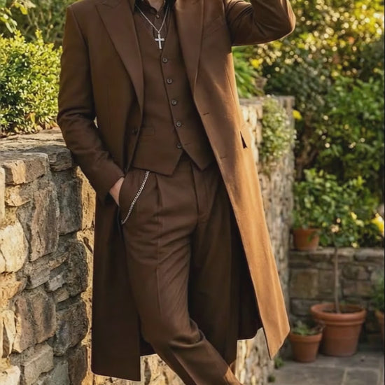 Bring back the bold elegance of the 1920s with this Men’s Brown Long Zoot Suit, designed in the iconic gangster and mafia style of the Prohibition era. This premium three-piece ensemble features a dramatic long overcoat, matching vest, and wide-leg trousers, creating the classic silhouette that defined vintage zoot fashion.