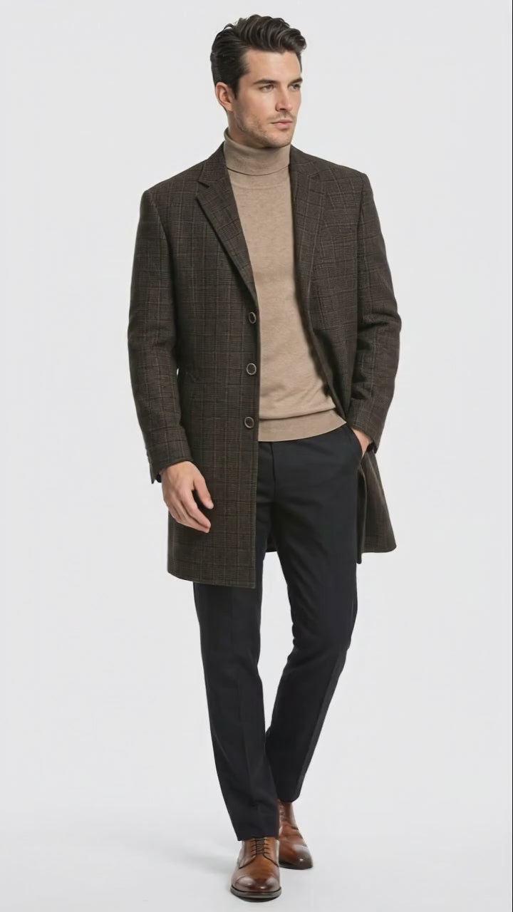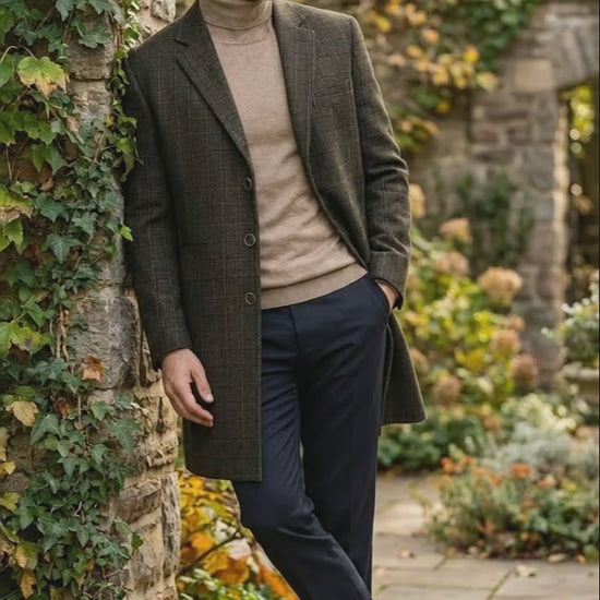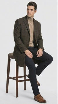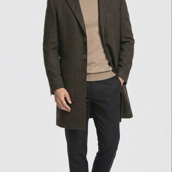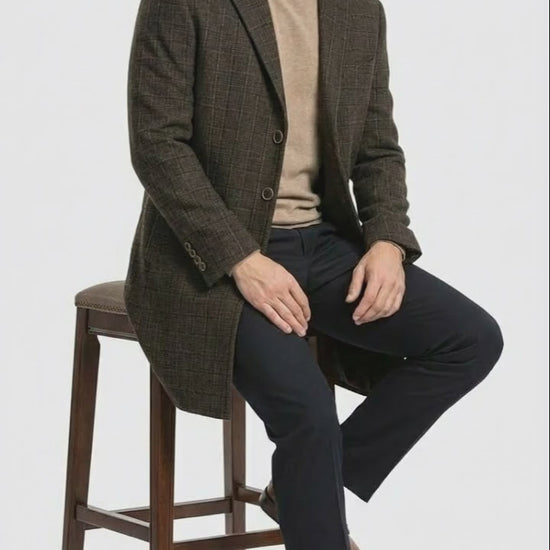 Men’s Brown Checkered Wool Overcoat – Long Winter Coat with Classic Plaid Pattern By Statement
