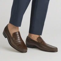 The crocodile leather’s distinctive scale pattern adds a bold and exotic touch, while the supple calfskin delivers flexibility and long-lasting comfort. The rich brown finish enhances the natural textures of both leathers, making these slip-ons versatile enough for business, formal events, and upscale evening wear.
