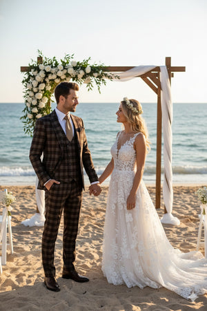 Bring timeless style and modern sophistication to your wardrobe with this Men’s Brown Plaid Three-Piece Suit Set. Designed with a classic slim-fit cut, this set includes a matching jacket, double-breasted vest, and tailored trousers, all featuring a refined brown plaid pattern that adds depth, texture, and character.
