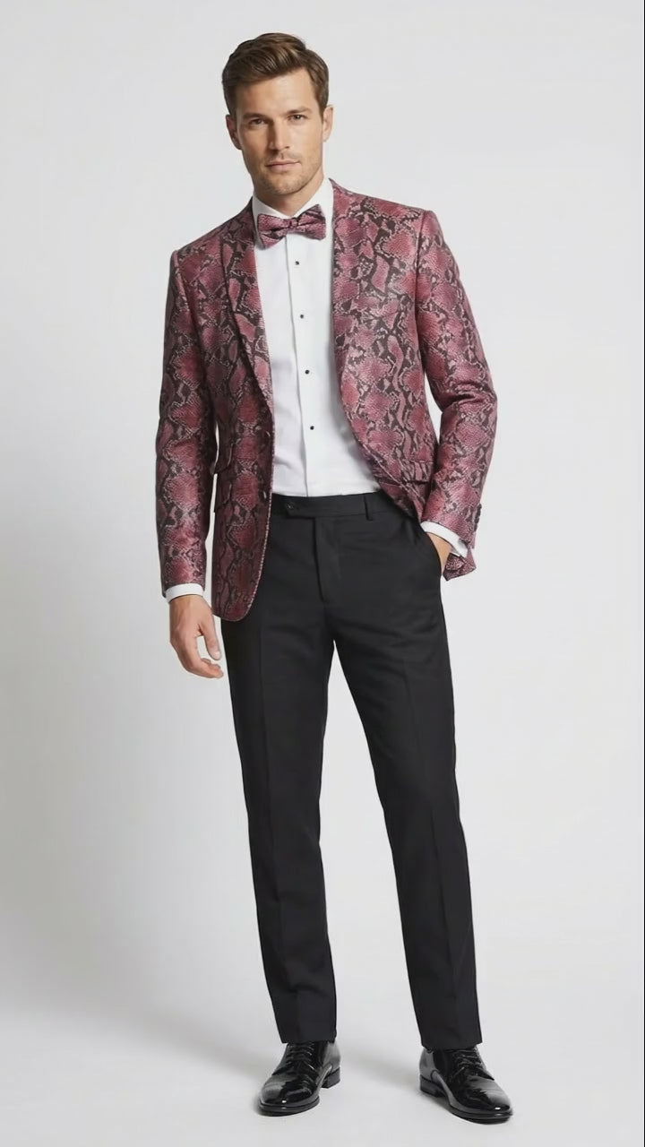 Men’s Burgundy and Black Snakeskin Print Blazer – Alligator Crocodile Sport Jacket Exotic Skin