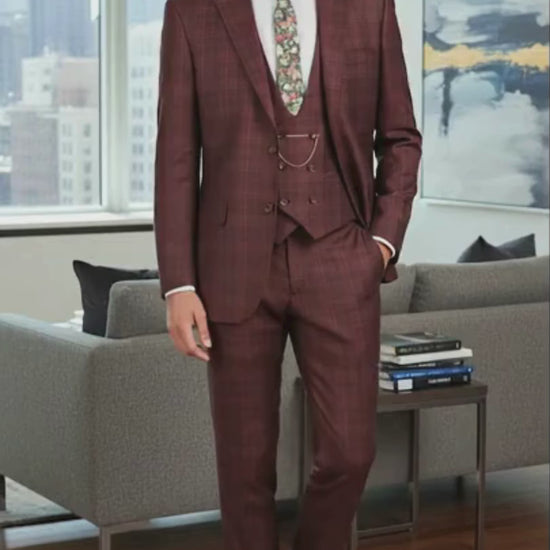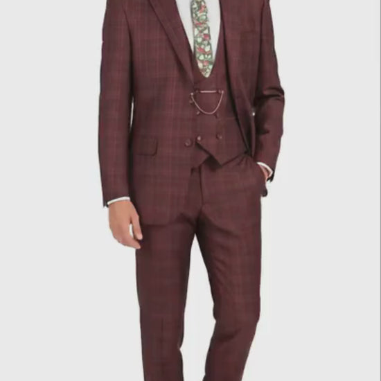 Elevate your wardrobe with this burgundy plaid 3-piece suit, a versatile and stylish choice for today’s modern gentleman.