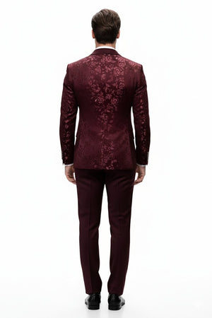 Men’s Burgundy Floral Jacquard Tuxedo Dinner Jacket – Paisley Velvet Lapel Formal Wear for Weddings and Prom
