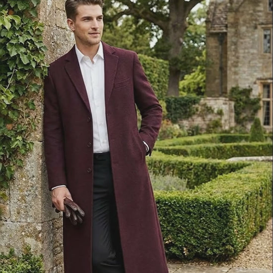 Men’s Burgundy Long Coat – Classic Fit Wool Blend Overcoat - Topcoat Full length