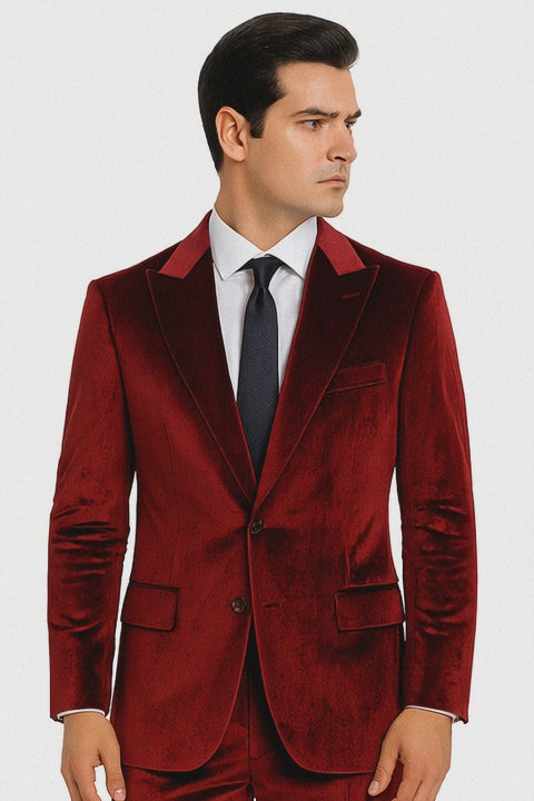 Men’s Burgundy Velvet Peak Lapel Suit – 2-Piece Skinny Fit Formalwear by Tazzio