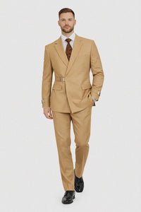 Men’s Camel Double Breasted Wool Suit with Metal Buckle Closure