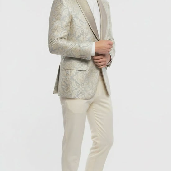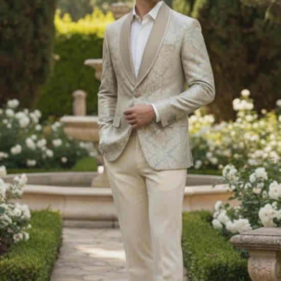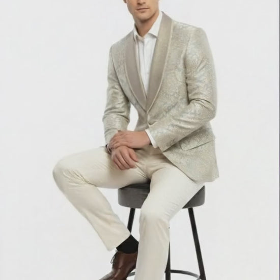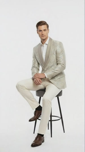 Men’s Champaign Silver and Cream Embroidered Luxury Blazer – Floral Pattern Wedding & Party Dinner Jacket in Light Tan Color